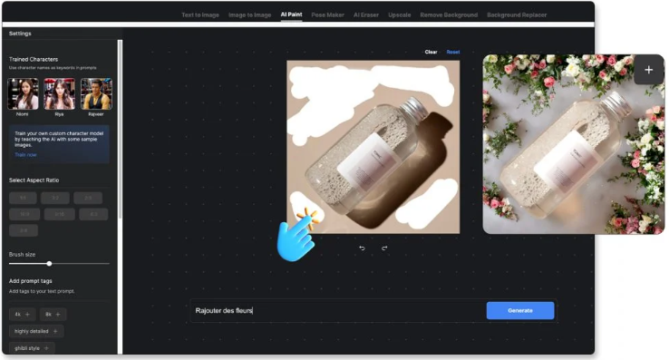 Que vous souhaitiez télécharger et recadrer des images existantes ou remplacer des éléments par des éléments générés par l'IA, notre outil polyvalent vous permet de laisser libre cours à votre créativité.